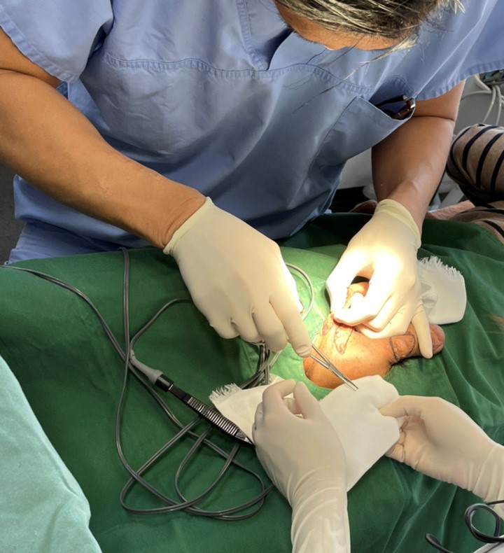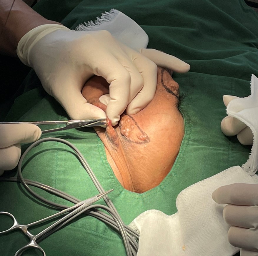 目印を付けた患部に局所麻酔を行い、表面皮膚をメスで切開、場合により炭酸ガスレーザーにて皮膚内の被膜ごと摘出していきます。