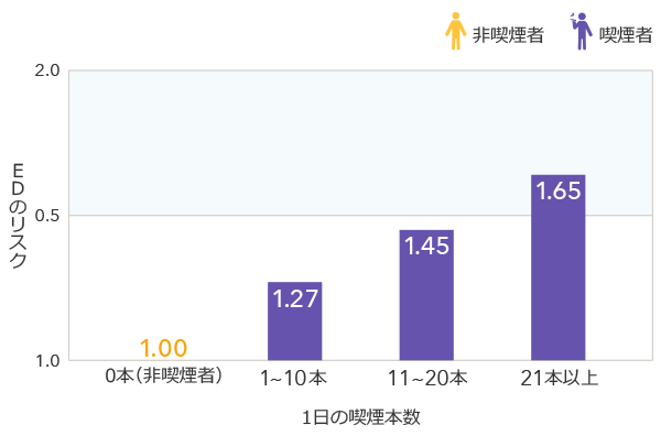 つまり、1日に箱(20本)以上タバコを吸う方は、吸わない方と比べてEDになる可能性が1.65倍も高くなるんです。