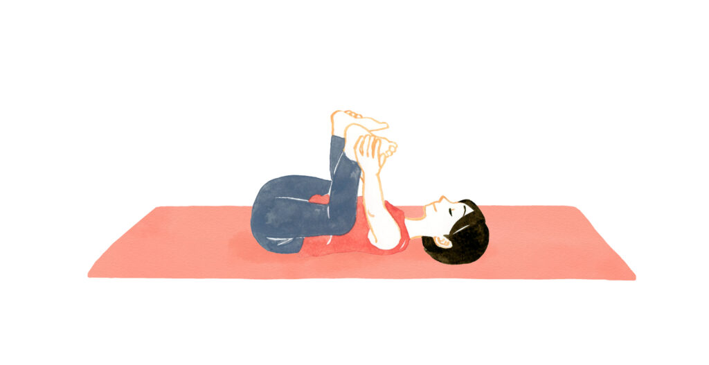 仰向けに寝転がり、両膝をゆっくり胸の方へ引き寄せます。膝を両脇に開きつつ両手で足の裏(または足首やすねのあたり)をつかみましょう。ちょうど赤ちゃんがあお向けで足をつかんで遊んでいるような姿勢になります。