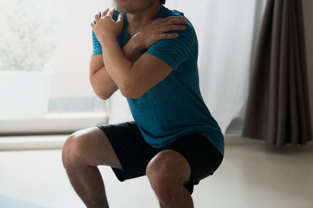 膝がつま先より大きく前に出過ぎないようにし、重心はかかと寄りに置いて腰を落とします。かかとが浮いてしまう場合は、無理せず浅めのスクワットでも構いません。また、しゃがんだ姿勢で骨盤底の筋肉をグッと力ませず、むしろストレッチされている部分を「ゆるめる」意識を持つと効果的です。膝や腰に痛みを感じるときは、中断して休めてください。