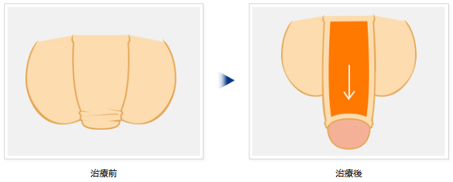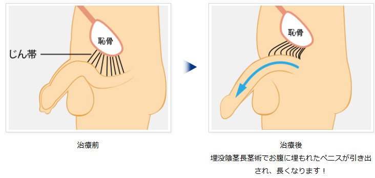 いわゆる「靭帯を引き出す手術」です。陰茎と恥骨を繋いでいる靭帯を外科的に引き出して固定し、埋もれていた陰茎を体外に引っ張り出します。靭帯による支えを緩めることで、今まで体内に隠れていた部分が表に現れ、現在より約2~5cm程度のペニス長長化が期待できる手術です。もともと周囲の人よりペニスが短いことに悩んでいる方、下腹部肥満でペニスが埋もれて小さく感じる方、「勃起時は普通だが平常時は極端に短い」という方には特に効果的とされています。