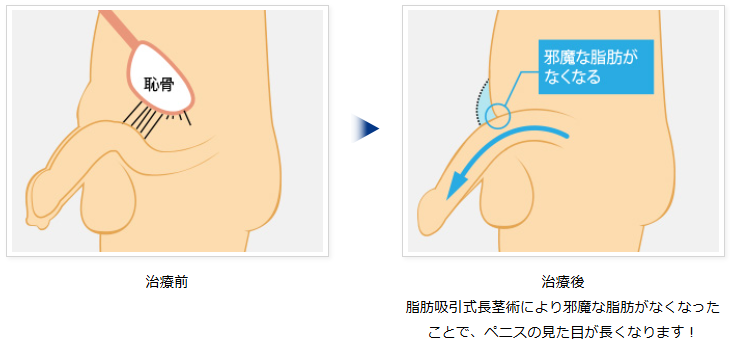 治療前は脂肪に埋もれていた陰茎も、脂肪吸引式長茎術によって邪魔な脂肪が取り除かれることで、隠れていた部分が表に出て長く見えるようになります。下腹部に脂肪が多くついてチンコが脂肪に覆われているタイプの方に特に効果的な方法です。脂肪吸引により一度取り除いた脂肪細胞は再び増えることはないため、適切な体重管理を続ければ効果は半永久的といえます。