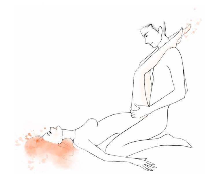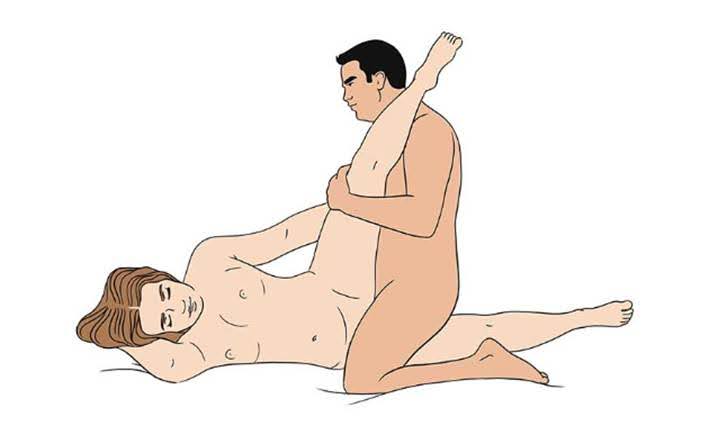 深山(しんざん)(屈曲位の一種):基本は正常位ですが、女性の両脚を男性の肩までぐっと持ち上げ、さらに女性のお尻の下にクッションを敷いて角度を調整したバージョンです。この体位だと男性側の腰の動きで亀頭が膣の前壁にしっかり当たりやすくなります。