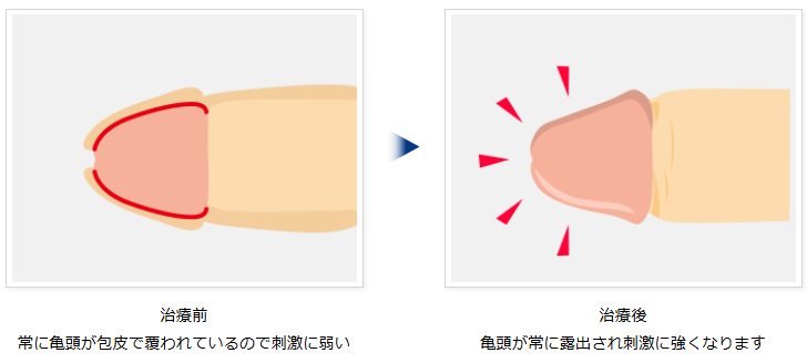 二つ目の理由としては亀頭が常に露出することで刺激に徐々に慣れていき、過敏さが軽減されるためです。包茎の方は亀頭が普段露出しない分、性交時に刺激が集中してしまいますが、手術によって亀頭が露出すると日常生活の中で下着との摩擦など軽い刺激に触れるようになり、次第に耐性がついていきます。