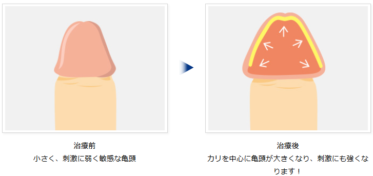 このように亀頭そのものが敏感すぎることが早漏の原因となっている場合、その治し方として有効なのが亀頭への注入治療です。具体的には、ヒアルロン酸などの安全性の高いフィラーと呼ばれる注入剤を亀頭に注射し、亀頭をふっくらとボリュームアップさせて刺激の伝わり方を緩やかにする方法です。