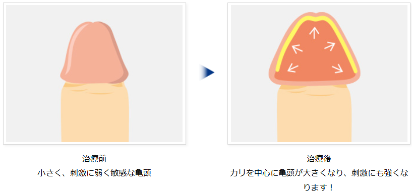 当院では早漏治療の選択肢として、独自の亀頭増大・強化術「リパスG」を提供しています。この治療では、デキストランという成分を亀頭に注入することで組織生成を促し、亀頭に適切な厚みと弾力を与えます。その結果、刺激に対する過敏性が軽減され、射精コントロール能力の向上が期待できます。