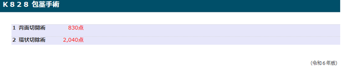 では、実際に保険が適用となった場合、包茎手術の費用はいくらくらいになるのでしょうか。保険診療の場合、患者さんの自己負担は通常3割です。手術そのものの点数(費用)は決まっており、下記のとおりです。