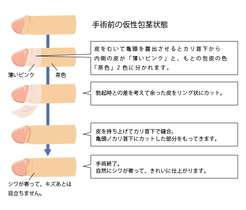 亀頭直下埋没法は、亀頭のすぐ下で余分な包皮を切除して縫合する手術方法です。傷跡が目立ちにくく、自然な仕上がりが特徴です。