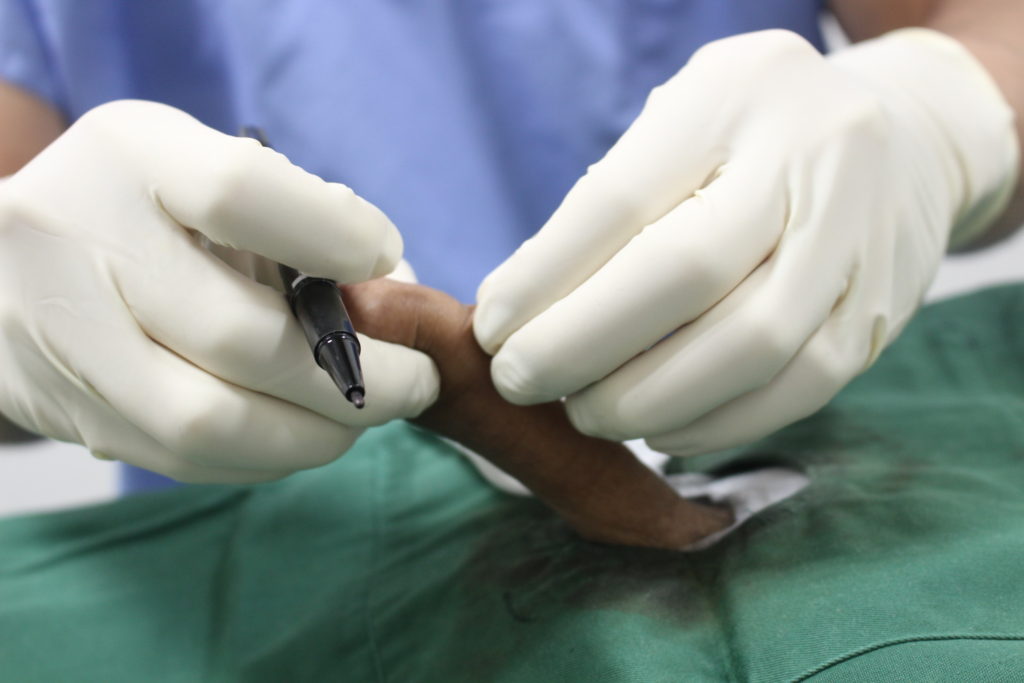 3、「取り除く幅が決定したら、正確にデザインする」:包茎手術によって取り除く皮の幅が決まると、亀頭直下から取り除く位置までをマジックでデザインします。