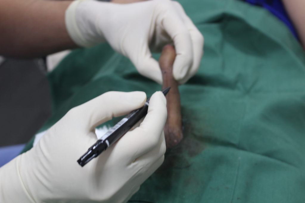 縫合するポイントが正確に作図されていないと、いわゆる「手術あとが目立つペニス」となってしまうため、皮の計測同様に非常に重要な作業です。