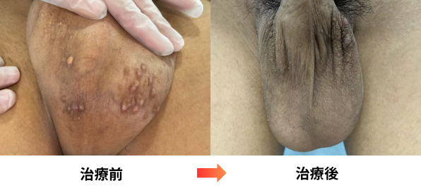 傷は浅いやけど程度になりますが、1〜2週間でかさぶたが取れて目立たなくなります。ブツブツが一箇所に密集している場合は、その部分の皮膚を小さく切除して縫合することでまとめて除去することも可能です。陰嚢の皮膚は伸びやすく傷の治りも良いため、多少切除して縫っても傷跡はシワに紛れてほとんどわかりません。
