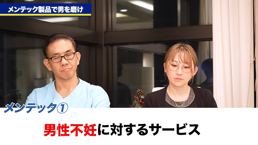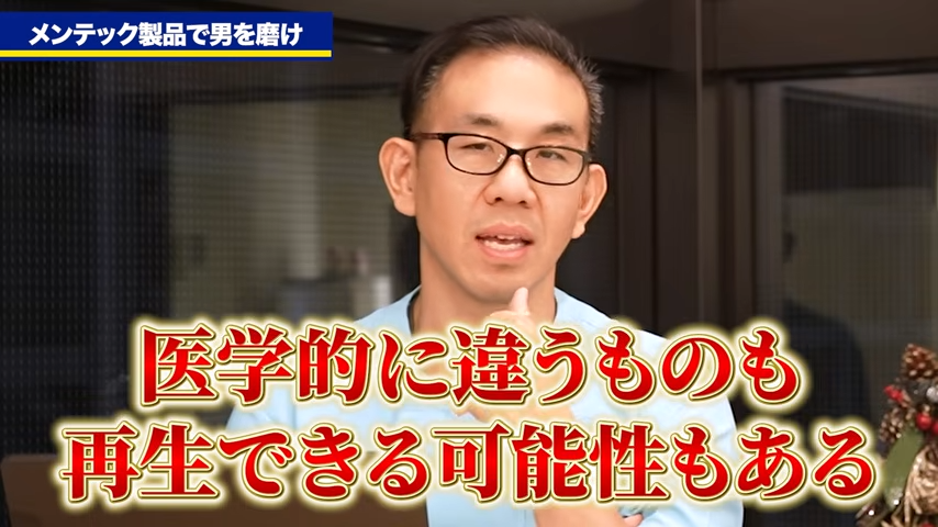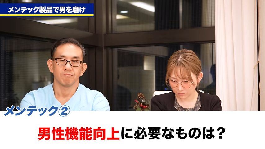 橘:なるほど。妊活に対しては精子を凍結するとか、あとは精液を今の状態からより良くしていくのであれば、TB-1などのサプリを使っていただくのがおすすめということですね。その次にメンテックの中でも、いわゆる男性機能の向上のためのプロダクトというものも言われていますけれども、ED改善とかですね、そういったものも含めて先生が最もおすすめするもの、方法というのはどういったものですか?