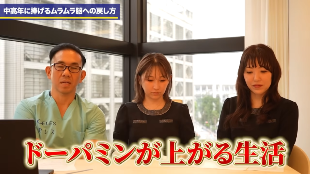 橘:日々の生活の中ではテストステロンを高める。これまで発信してきた内容というところと、+新たな体験をする。より刺激を自分に与える。そういうところがよりドーパミンを高める、ドーパミンの分泌を高めるところの方法としては良いという事ですね。はい。