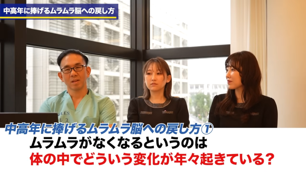 橘:男性の場合は特に若い時のムラムラ感っていうところ。ただこれが逆に、いざ年をとって、そのムラムラとか性欲が失われてくると、やっぱりそれも人生のハリだったりとか、活力っていう部分に関して見てみると、どうしてもどんどん落ちてしまっている状況も多くあると思いますので、この男性のムラムラを取り戻す方法っていうところを今回は先生に教えていただきたいなと思います。