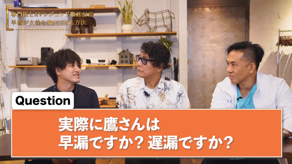 橘:では鷹さん、早速ではあるんですけれども、女性を知り尽くしている鷹さん。実際に鷹さんは早漏ですか?遅漏ですか?