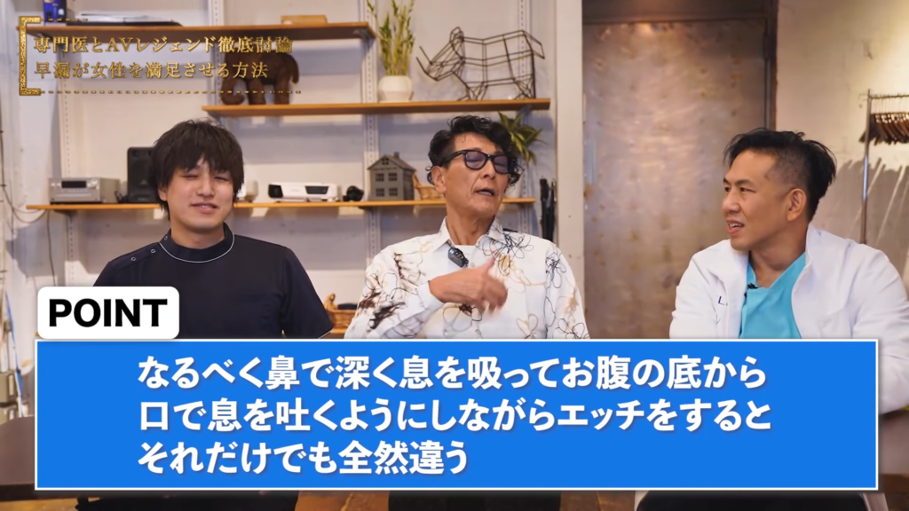 加藤鷹:なるべく鼻で深く息を吸って、お腹の底から口で息を吐くようにしながらエッチをすると、それだけでも全然違う。10秒の人がいきなり5分10分にはならないかもしれないですけど、10秒の人が1分ぐらいにはなったり、それを繰り返すことで1分が3分になり、みたいなこともある。