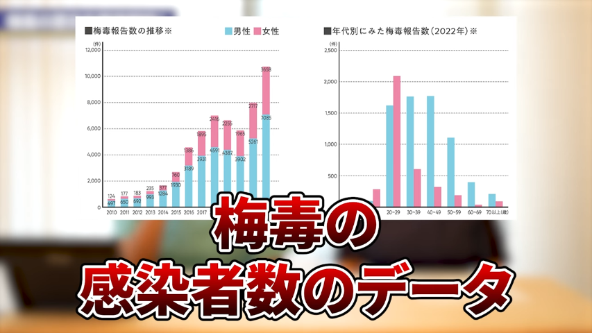 橘:あとはですね、先ほど2015年ぐらいから増えてきたなっていう印象だったと思うんですけれども、ちょっと図を出しているんですが、データをですね。これ厚労省から出している梅毒の感染者数のデータなんですが、もちろん左のグラフで見ると、年々件数は増えているということがわかりますが、右のグラフで見ると、男女別の感染者数、年齢別に。
