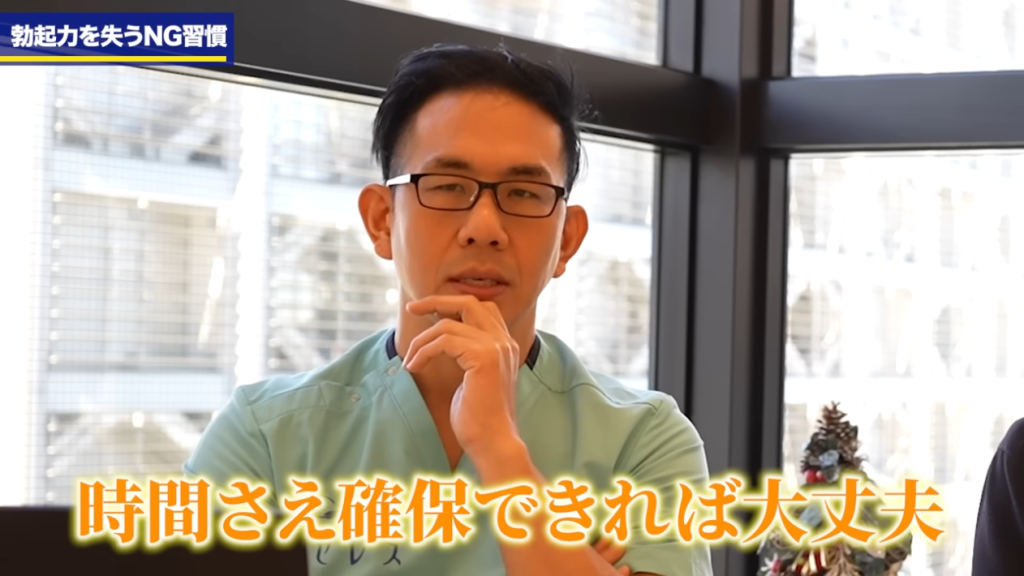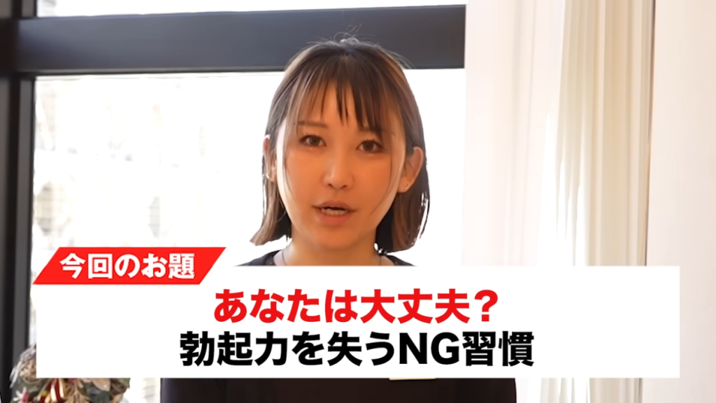 橘:なので今回は意識のところをちょっと考えようという事で、今までもテストステロンを高めるとか性機能を高めていく習慣っていうところはお話したんですけれども、今回は逆にこれを知らずにやってしまっていると勃起力を失いますよというNG習慣について解説していただきたいなと思います。なのでこの動画を見ている方は、まずは普段やりがちなNG行動に気づき、そして自然にいい習慣を身につけていこうという為の動画となっています。