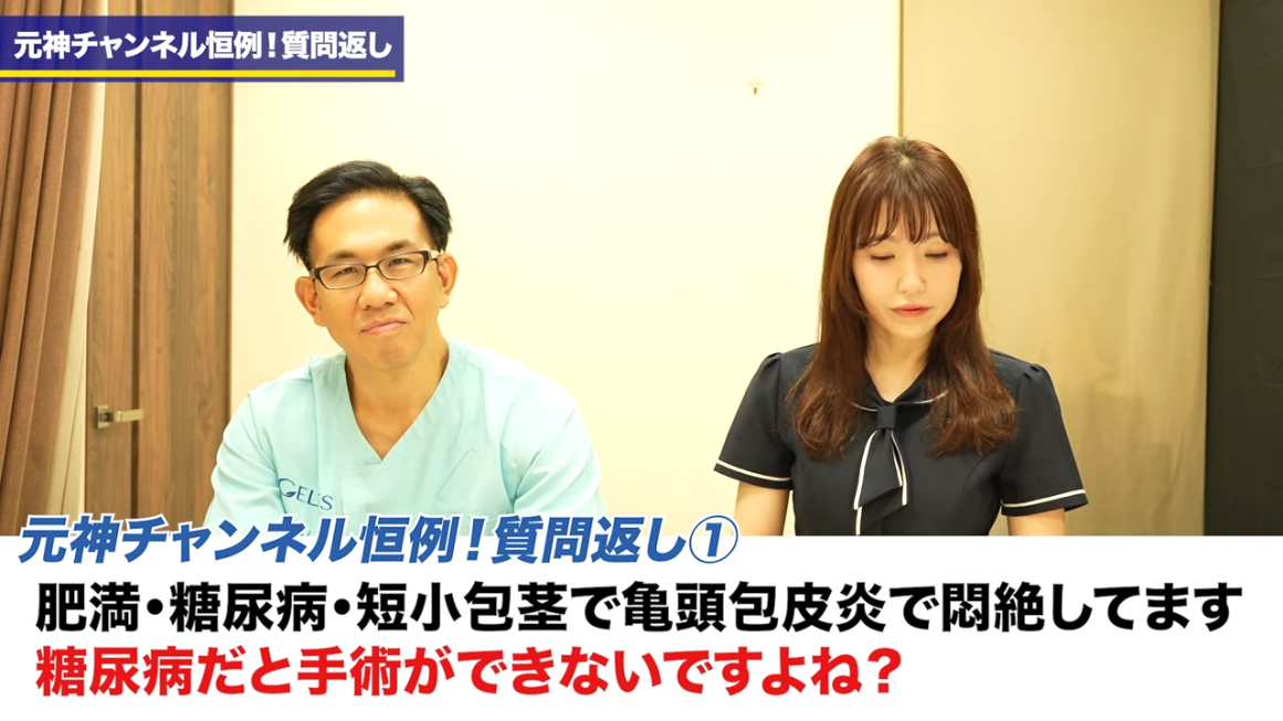 橘:まず1つ目の質問がですね、「肥満・糖尿病・短小包茎です。亀頭包皮炎で悶絶してます。糖尿病だと手術ができないですよね?最近糖尿病を理由に手術を専門医から断られました」。