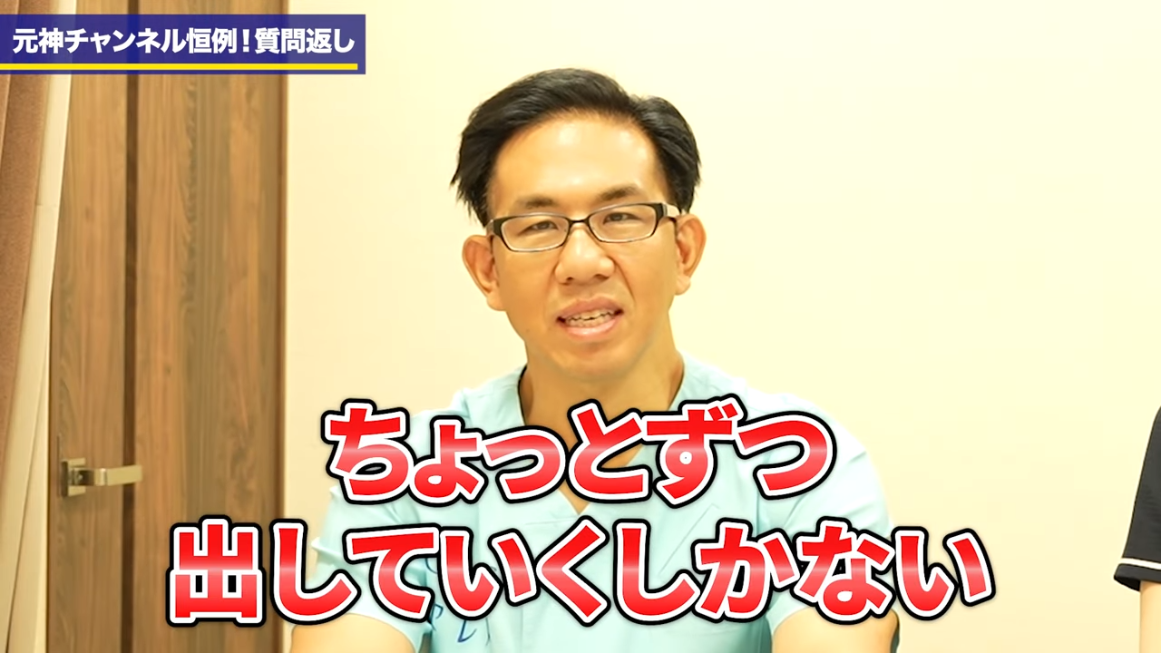 橘:1人1人の登録がすごく大きな力となりますので、ぜひよろしくお願いいたします。ということで今回はですね、元神チャンネルの定例企画となります、コメント返しをしていきたいと思います。今回もですね、治療に関する質問をご用意しましたので、先生にお答えいただきたいと思っております。