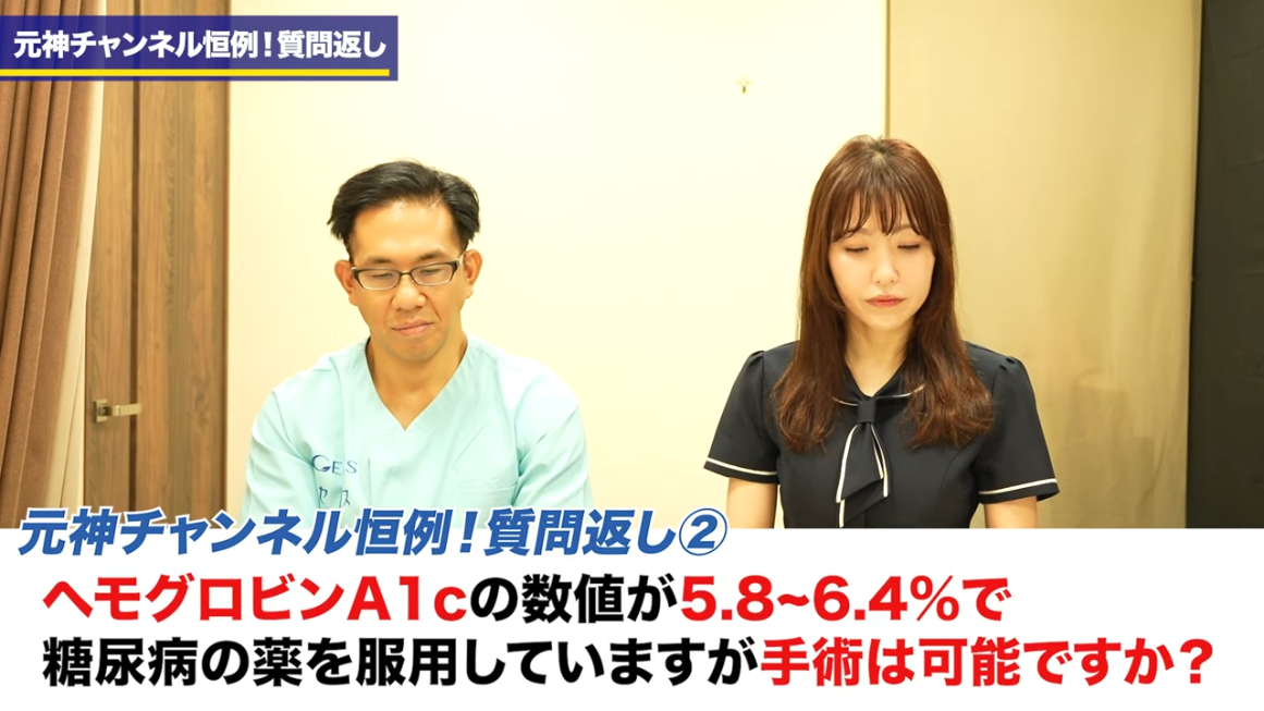 橘:では次です。「ヘモグロビンA1cの数値5.8〜6.4%で糖尿病の薬を服用しています。手術は可能ですか?」。