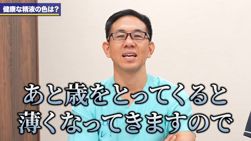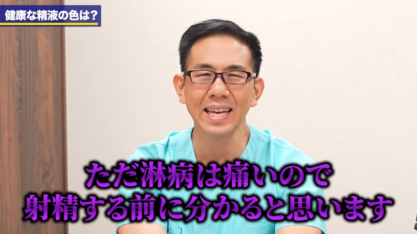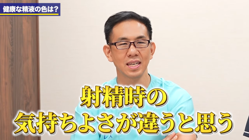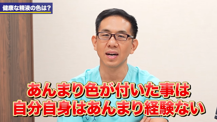 橘:射精した時にふとなんか精液が黄色いなとか茶色いななど、いつもと違う色に困惑したというご相談をですね。たまに受けるんですね。先生、今までこういったその精液の色とかご相談だったりとかっていうのは耳にしたことありますか?