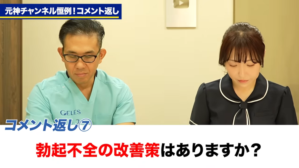 元神先生:まあ薬の増量をまず試してみて、薬の増量だけじゃダメな場合はやっぱりもうテストステロンが下がっている可能性もあるので、うちで販売してるTB-1っていうサプリを使ったりですね、あるいはうちでED1000という、もう血管自体を増やしてしまう治療を行ってますので、そういうED1000ていう治療をやってみるとかですね、いいと思いますね。