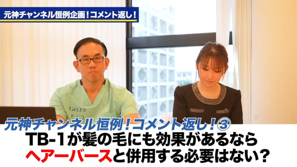 橘:次がサプリの動画のコメントになっています。「TB-1ですね。TB-1が髪の毛にも効果があるのなら、ヘアーバースと併用しなくてもTB-1に一本化して良いですか?かぶっている成分、亜鉛の過剰摂取を避けるためにも」ということで。はい。補足すると、ヘアーバースというのが先生が開発したサプリですね。はい。これと併用していいか。