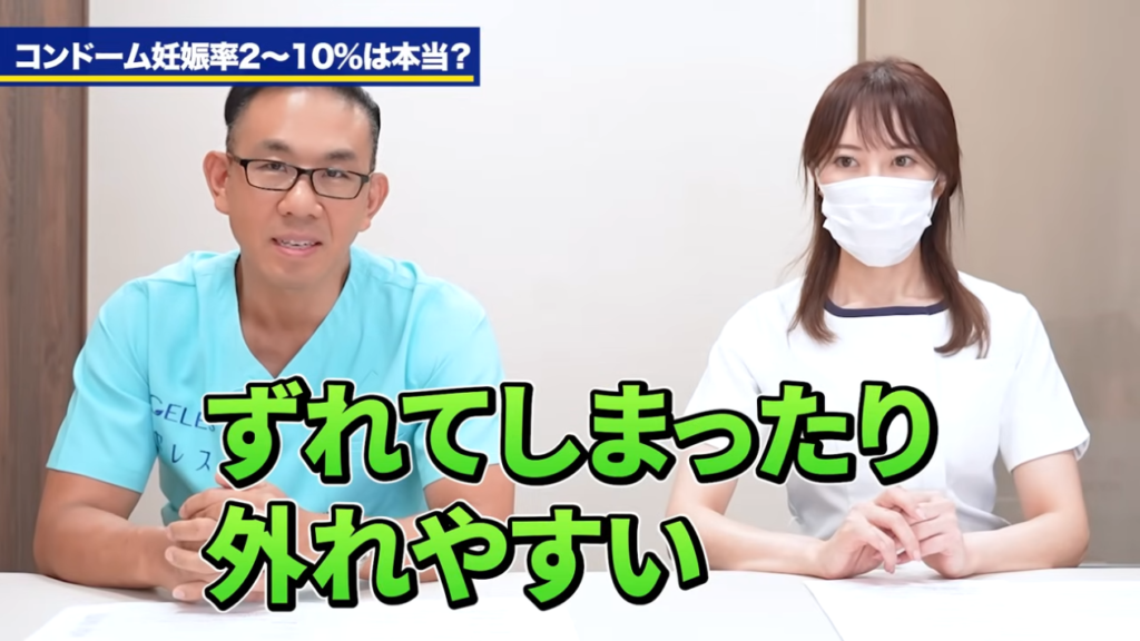 元神先生:ただコンドームってめちゃめちゃよく失敗したりするんですよ。使い慣れていないと。あとはつけるタイミングが遅かったり、途中で破けたり。あるいは意図的にですよ、破損しているものを渡されたり。そういうこともあるんですよ、世の中。で、その結果妊娠しちゃうというのも結構多いんですね。で、完璧に使いこなしている人はまあ2%以下なんで。それもカップルで最低週1回のセックスをしての年間の妊娠率なんで、2%以下は結構低いことは低いです。