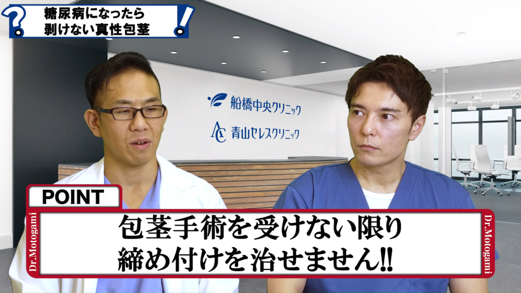 元神先生:糖尿病は全てにおいて炎症が起こりやすいんですよね。末梢血管が細くなっている状態で炎症が起こりやすいんですけども。ちょっとした包皮の傷は糖尿病じゃない方も実は起きているんですけども。皮膚を引っかいたりですね。糖尿病じゃない方は本人も気づかずに治っていくんですけども、傷が糖尿病の方は非常に治りにくくて積み重なって、どんどん擦り傷が深くなっていくんですね。炎症で皮膚が固くなっていくんですね。なかなかイメージ湧きにくいかもしれませんけど、皮膚が固くなると要は締め付けが起こって、いわゆるカントン包茎とか究極的には真性包茎といって剥けない状態になってしまうということですね。