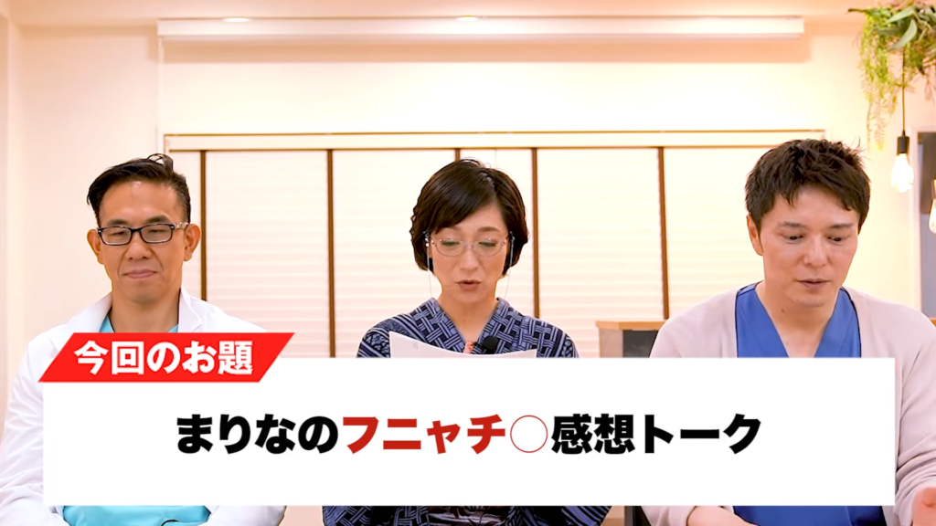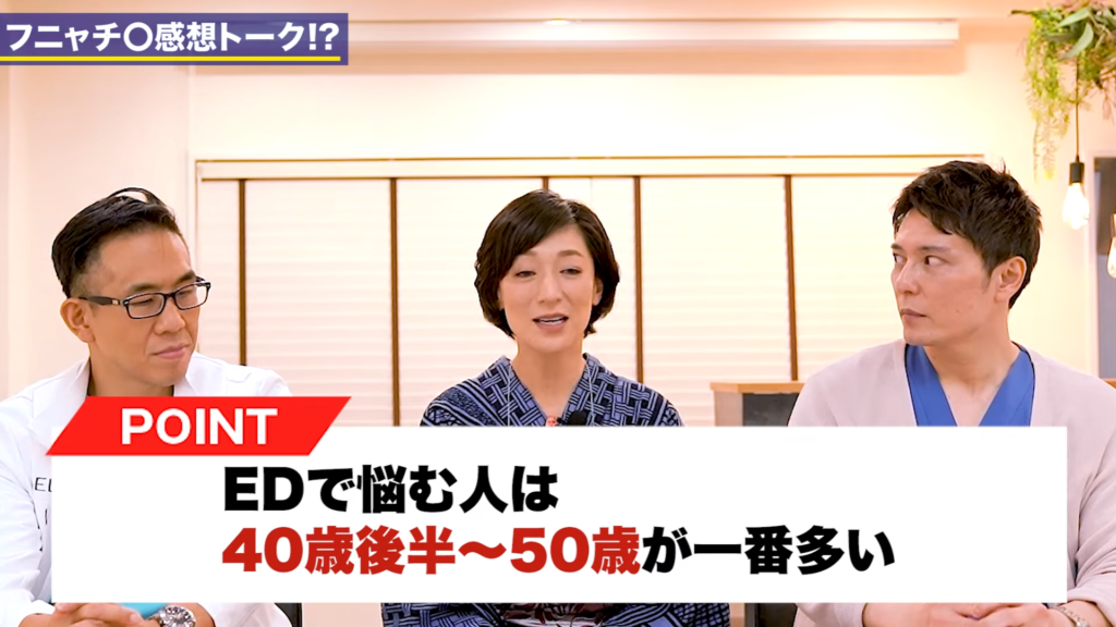 男性カウンセラー:今回は私たちアラフィフ世代からだんだんと深刻な悩みになってくるフニャチンについて、まりな様の見解と元神先生の医学的なお話を聞きました。ありがとうございました。