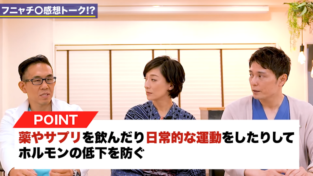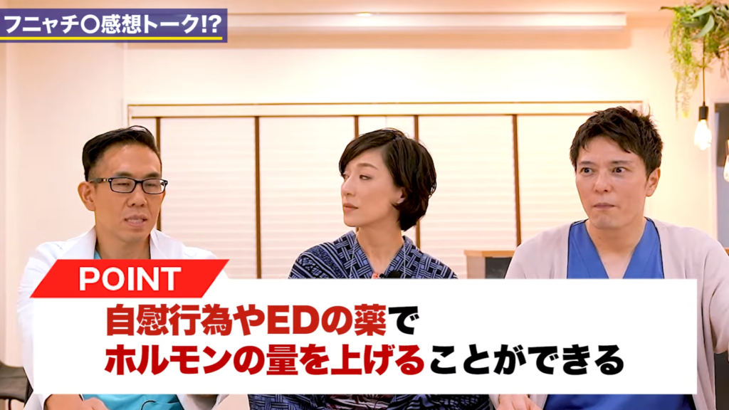 元神先生:頑張って自慰行為をすれば上がってきますし、実はEDの薬を毎日飲むっていう方法もあるんですよね。毎日、容量の小さいものを、5ミリグラム以上を毎日飲むと、男性ホルモンが上がるっていうデータもあるんですよ。