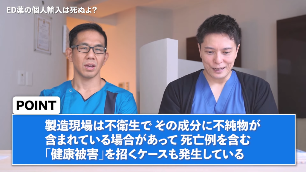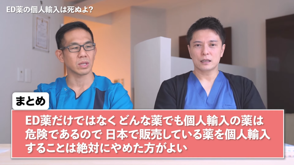 男性カウンセラー:命と引き換えって先生おっしゃいましたけど、まさにその死亡例もあるってことを考えると命と引き換えなんですよね。「それでも飲みますか?」という感じですけれども、多分サムネイルでは、ED薬個人輸入すると死ぬよぐらいの、ちょっと危ないよっていう煽りを入れようと思うんですけど、ポチッて観てる方も、ひょっとしたらネット販売で購入してる方、いらっしゃると思うんですけれども、先生どうでしょう、ちょっと呼びかけてあげてください。