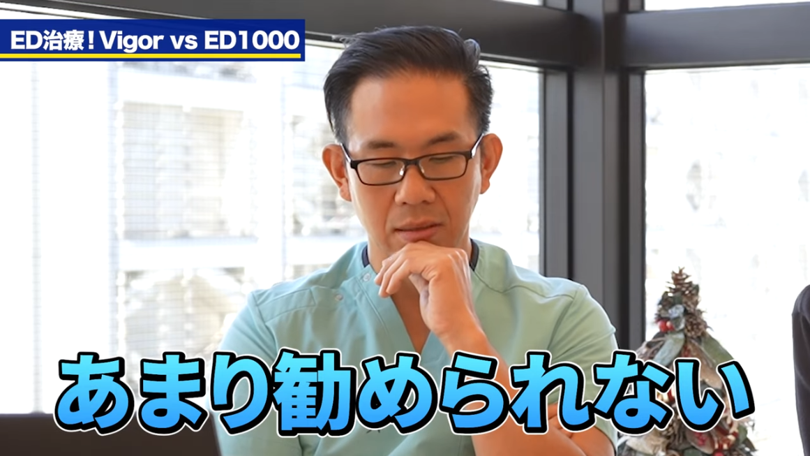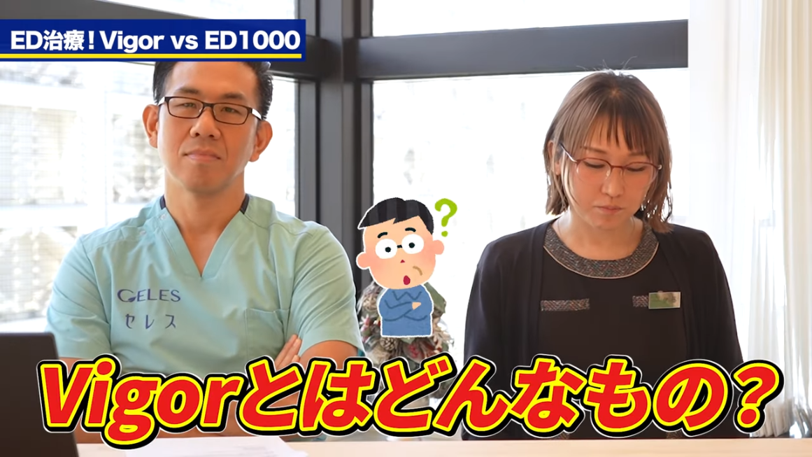 橘:率直な効果的な部分でも弱いですよね。Vigorと治療薬のED1000、この3つがあると思うんですけれども、ちょっとまずそれぞれのメリットとデメリット、ちょっとこう整理していければなと思うんですけれども、まずこのVigorのメリット。