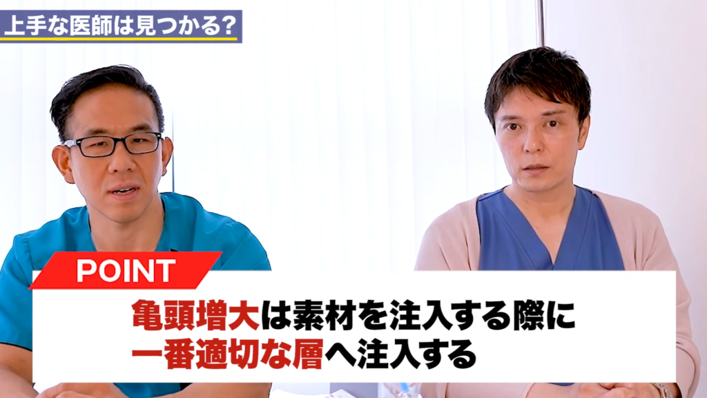 男性カウンセラー:増大治療についてですけど、「注射すれば大きくなるんでしょ?」みたいなドクターもいるじゃないですか。やり方によってはでこぼこしてしまうとか、バランスが悪くなる、大きさが結局反映されていないとか、入れたものの大きくなっていないってケースもありますよね。これはどういう風にしたらいいんですか?