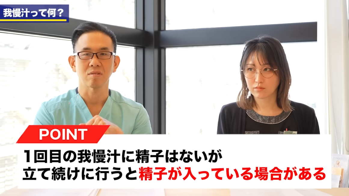 元神先生:あとね、大事なのは…カウパー腺自体には精子はないんですよ。なので、よく膣外射精っていう方法で避妊する方いると思うんですけども、それは一応医学的にはちゃんとそれを実行できれば避妊にはなるんですよね。ただですよ?1回射精した後の尿道に残ってますから、精子が1回射精した後は。2回目以降でそのまま連続ですぐやった場合はですね、それで妊娠しちゃうことありますから、膣外射精しても。そこは大事なんですよね。だから1回目の我慢汁には精子が入ってないですけども、2回目立て続けにやった場合は入ってる可能性があるってことですよね。