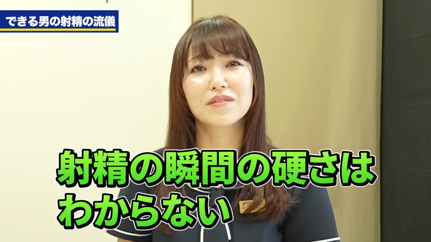 橘:望むタイミングで射精できる、これは一番大事かもっていう感じですかね。次にですね、射精の瞬間っていうところなんですが、射精する時はペニスの膨張率が上がる、硬さが一番マックスになるってお話だと思うんですけど、その射精の瞬間の硬さとかっていうのは、女性側からするとわかるものですか?