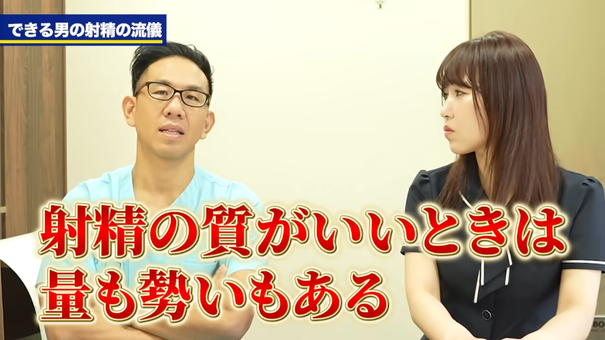 元神先生:ただ基本的にはですね、射精量は溜めれば溜めるだけ多いっていうのもあるんですけども、性行為中に長く勃起してる時の方が行為自体も長くて、寸止めとか我慢したり、そういう我慢してる時の方が射精量も多いですし、勢いも高いって言われてるんですよね。短い性行為でやると、意外と量も勢いも短くて、いろんな体位をやって我慢して我慢して射精の質が良くなった時は、量も勢いもあるんですよね。