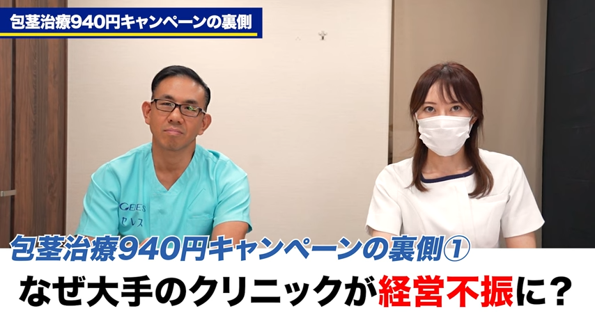 橘:運がよければ近藤さんが担当するかもしれない(笑)。ということで、ぜひお問い合わせお待ちしております。今回は包茎治療940円キャンペーンの裏側についてお話ししていきました。参考になった方はチャンネル登録・高評価をよろしくお願いします。ではご視聴ありがとうございました。