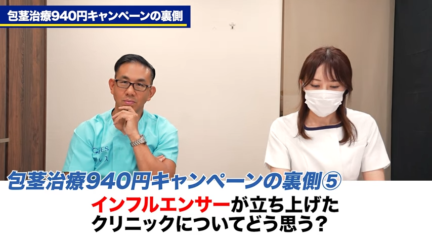 橘:包茎クリニックって、インフルエンサーが立ち上げたクリニックとかも最近あったりするじゃないですか。そういうところに対しての先生のご意見みたいなの何かあったりしますか?