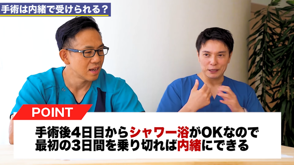 男性カウンセラー:はい。あとお着替えとかお風呂とか仕事とか運動っていうのは、まぁどうにかやり過ごしていただくという。やっぱりSEXですよね。これはもう手術方法変えたとしてもなかなか期間としては短くなりづらい。