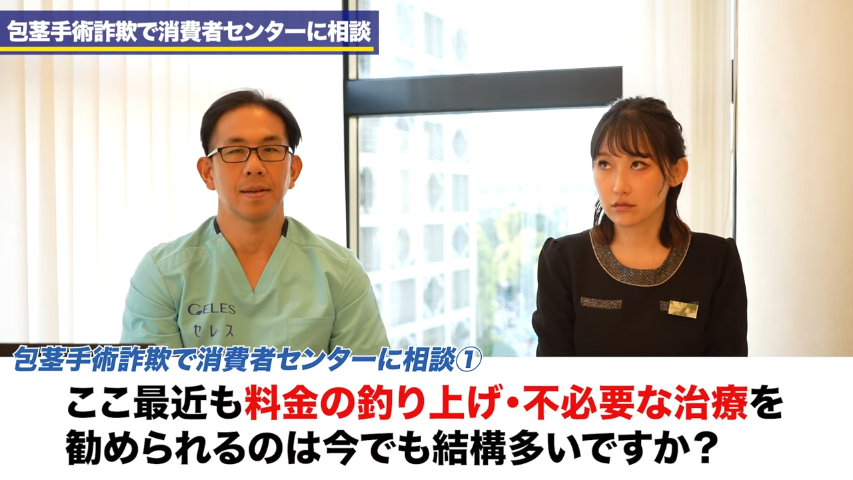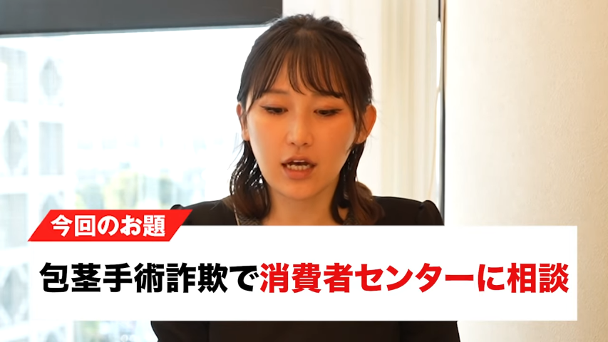 橘:これまでもですね、うちのチャンネルでも包茎手術による詐欺被害だったりとか、ぼったくりとかてちうようなお話って今までもしてきたんですけれども。今回ですね、調べていく上で消費者センターから出されていた情報としてですね、実際の患者さんが消費者センターに相談をして、その後どうなったかっていうのが1つ事例として挙げられていましたので、それを今回ご紹介させていただきたいなと思います。