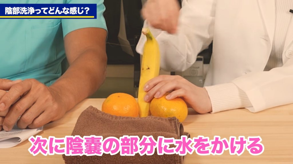 スタッフ:イエーイ!今回は前回に引き続き、陰部洗浄について取り上げていきたいと思います。今回はどんなタイミングで陰部洗浄が行われて、どんなふうに触られるのか、みかんとバナナとタオルを用意したので実践していただきます。