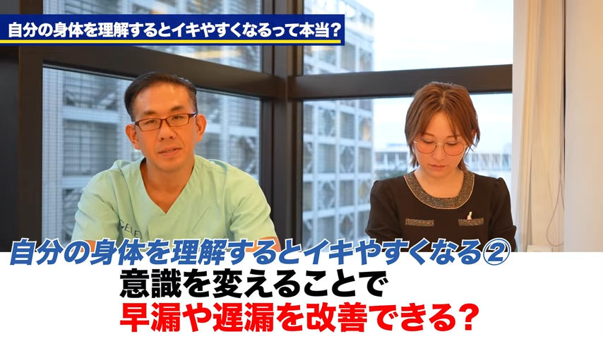 橘:男性の場合は、自分の感覚に対して無頓着な場合は早漏や遅漏になりやすいという話があったと思うんですけれども、これもやっぱり意識を変えることで、そこを改善することはできるものなんでしょうか?