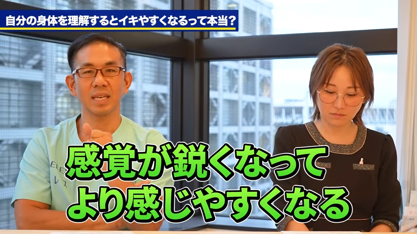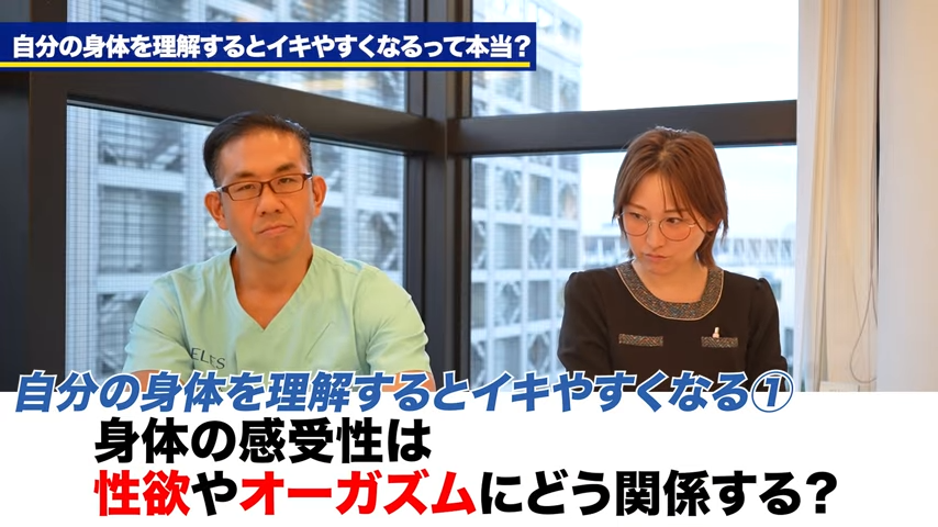 橘:今回の動画では、なるべくオーガズムを得やすくなるための方法を調べていく中で、身体の感受性というところに対して自分で気づき、そして意識することでオーガズムに達しやすくなるみたいな情報を見ましたので、今日はその点について先生に聞いていきたいと思っております。身体の感受性、そしてそれが性欲やオーガズムに対してどう関係するのか、先生の見解を聞いていきたいと思います。