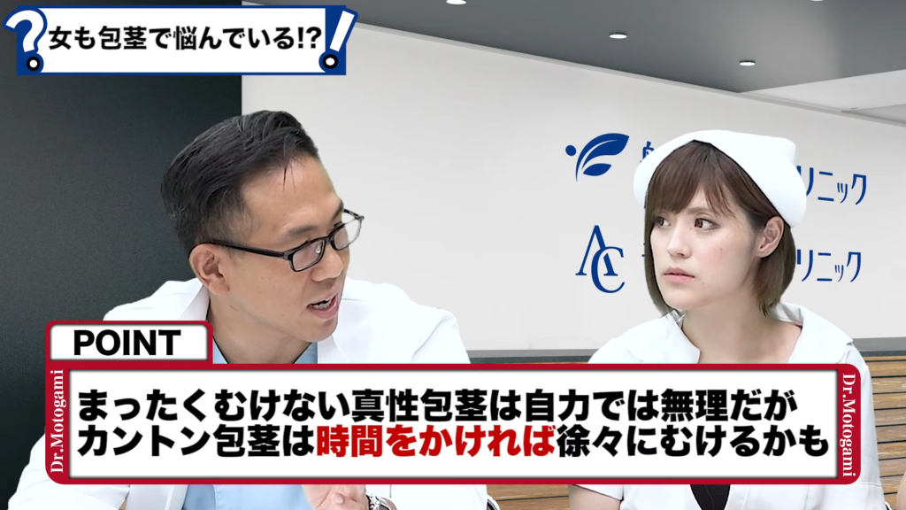 元神先生:多分もう恐らく無理ですね、ガチガチの真性包茎なら。カントン包茎はむくとちょっとだけ亀頭が見えるとか、そういう感じであれば時間をかければ、本人が。徐々にむけさせ慣れることはできますけどね。結構時間はかかります、1年とかそういう感じで。本人がやるしかないですね、これは。
