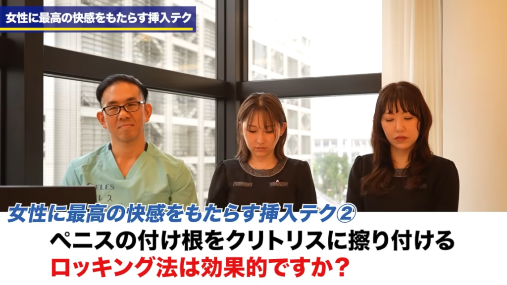 :次の方法を説明します。次がですね、ロッキング法といいまして、これはペニスを根元まで挿入し、揺らし刺激する方法。ピストンを激しくするのではなく、ペニスの付け根をクリトリスに擦り付けるように上下に刺激する方法ということで、ペニスが内部にとどまり、同時にクリトリスを刺激する法。腟内刺激とクリトリス刺激によってオーガズムに達しやすくなる、というのがこのロッキング法というものになりますが、はい。これちょっとこう角度とまたちょっと違った話になるんですけど、先生この部分に関してはいかがでしょうか。
