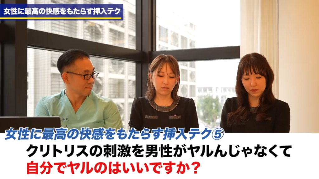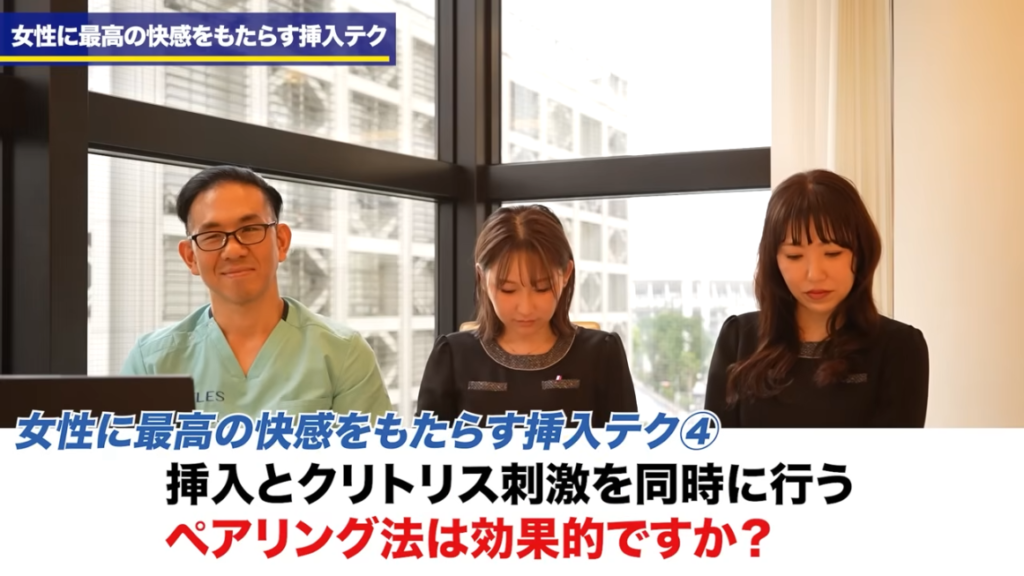 橘:じゃあ次4つ目がですね、ペアリング法というもので、これは挿入とクリトリス刺激を同時に行うこと。挿入しながら女性自身もしくは男性が指で刺激をするということで、同時刺激というようなものになります。はい。