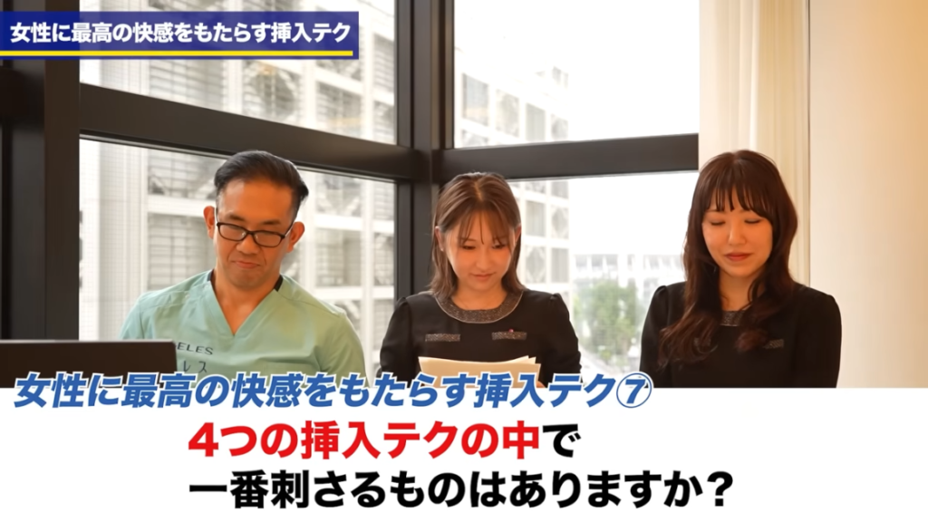 橘:じゃあこのリズムと一定の強度、そういうのがポイントとしても大事ということですね。はい。実際に今この挿入テク4つ紹介しましたけれども、伊藤さん川村さんこの4つの中で一番刺さるものは何かありますでしょうか。