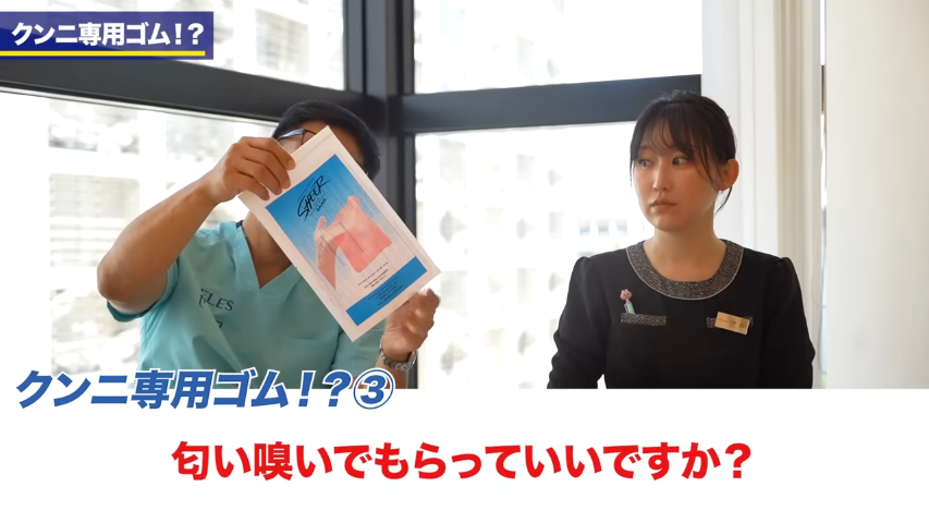 橘:はい、結構、日本ではコンドームがもちろん主流というか、皆さん知ってると思うんですけど、今回僕も調べてみて初めて知った商品だったので、実際にこのクンニをするときに使うものということで、実際にどういうものかっていうのを本日商品ご用意しましたので、それをもとにですね先生、伊藤さんに実際に見てもらってレビューをしていただければなと思います。先生、まずこのクンニ専用ゴム使う理由としては、主に性感染症予防。